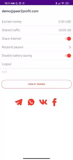 The Peer2Profit application allows you to make money on the distribution of your unused Internet connection! Share your WiFi or mobile connection and get paid for every gigabyte of traffic. In order to start earning, just create a free account on our website and log in to the application. Peer2Profit uses your connection to help companies and individuals around the world access the Internet without restrictions. In other words, it's almost the same as sharing your WiFi with friends. Visit https://peer2profit.com for more information on the most common use cases.
