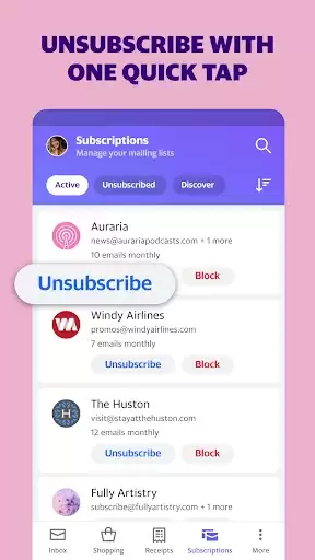 It's time to get stuff done with the Yahoo Mail app. Get organized with the help of the Mail app. Just add your Gmail, Outlook, AOL, MSN, Hotmail, Yahoo Email accounts, or others to get going. We automatically organize all the things life throws at you, like receipts and attachments, so you can find what you need fast. Plus, we've got your back with other convenient features like one-tap unsubscribe, free trial expiration alerts and package tracking.